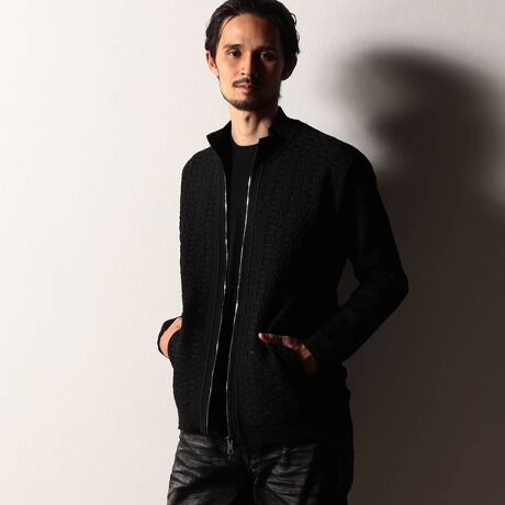 身頃をシャープなブロック柄とライン柄で編み立てたフルジップタイプのドライバーズニット。