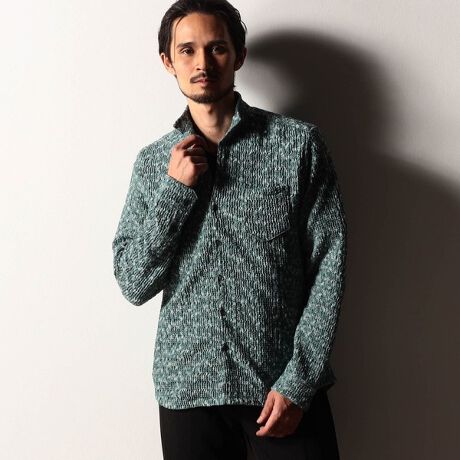 合繊のジャカード織り素材です。ポコポコしたオウトツ感のある組織と何色も混じった様な綺麗な色目、テンションのあるマルチストレッチが特徴です。