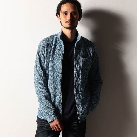 合繊のジャカード織り素材です。ポコポコしたオウトツ感のある組織と何色も混じった様な綺麗な色目、テンションのあるマルチストレッチが特徴です。