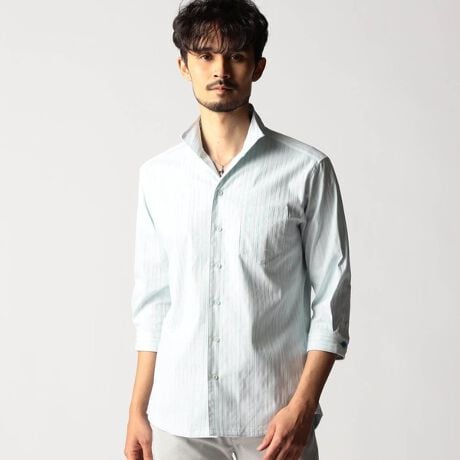 衿端にワイヤ−を仕込んだスタンド・イタリアンカラ−シャツ。袖丈は肘下の7分丈デザイン。カフス裏や裾裏には裏面のストライプ柄を使いアクセントになる様にしています。生地の配色とリンクした釦も、ちょっとしたアクセントになっています。