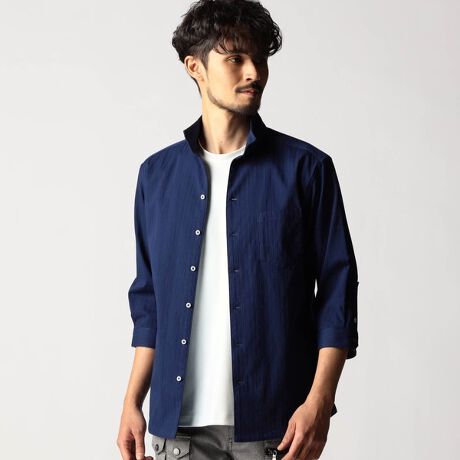 衿端にワイヤ−を仕込んだスタンド・イタリアンカラ−シャツ。袖丈は肘下の7分丈デザイン。カフス裏や裾裏には裏面のストライプ柄を使いアクセントになる様にしています。生地の配色とリンクした釦も、ちょっとしたアクセントになっています。