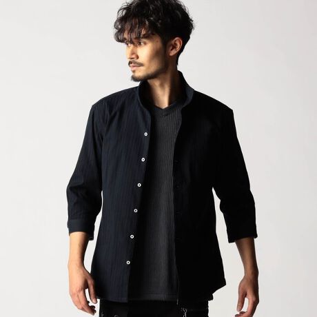 衿端にワイヤ−を仕込んだスタンド・イタリアンカラ−シャツ。袖丈は肘下の7分丈デザイン。カフス裏や裾裏には裏面のストライプ柄を使いアクセントになる様にしています。生地の配色とリンクした釦も、ちょっとしたアクセントになっています。