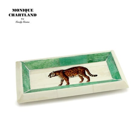 [型番:gfc-mq-0156]ボーンを組み合わせて作られた、メガネがジャストサイズの横長のトレイです。中央に書かれたヒョウが印象的なデザインです。ヒョウは、魔除けや厄除け、金運向上、商売繁盛などの縁起の良い動物として世界中で崇められています。トレイとして使用はもちろん、そのままアートとして飾ることもおすすめです。