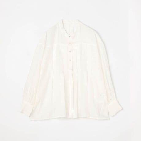 衿ぐりはバンドカラーでスッキリと、袖口ギャザーと裾はボリュームを持たせ、1枚でも様になるブラウスです。