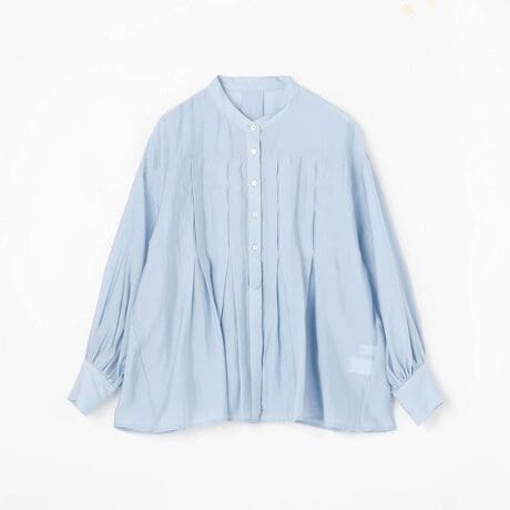 衿ぐりはバンドカラーでスッキリと、袖口ギャザーと裾はボリュームを持たせ、1枚でも様になるブラウスです。