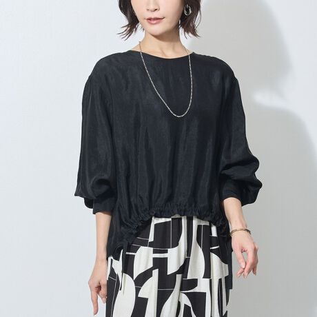 裾がドロストできる仕様の、シンプルなノーカラーブラウス。