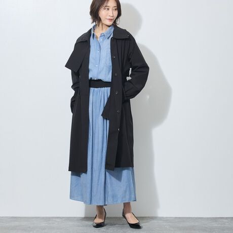 バックスタイルはアンブレラヨークとセンターベント入り。衿端とウエストのゴムスピンドルがデザインポイントで、シンプル過ぎないのがうれしい万能コートです。
