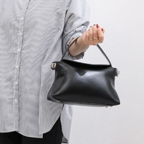 中央が絞られたコロンとしたスクエア型が可愛らしくも洗練された印象を与え、デイリーからオフィススタイルまで幅広くマッチします。
