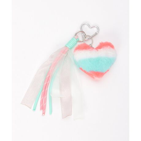 レインボーカラーのフェイクファーハートに、ハート型のカラビナとカラフルロープを組み合わせたデザイン。