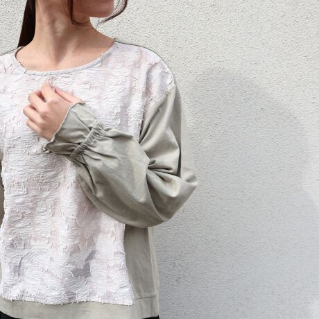 [型番:161801]フラワー柄のカットジャカードとカットソー素材でブラウス見えするデザインTシャツを作りました。袖口はゴム仕様なので、たくし上げて着用することもできます。同素材のパンツと合わせればキレイ目なお出かけ着に◎※同素材品番:161401 カットジャカード切替フレアパンツ※商品画像は光の当たり具合などにより実際の色味と異なって見える場合があります。エトレリー etre relie