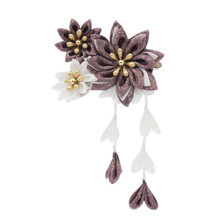 ラメが光るつまみ細工の花々のコサージュにはぶら飾りが華やかな雰囲気です。