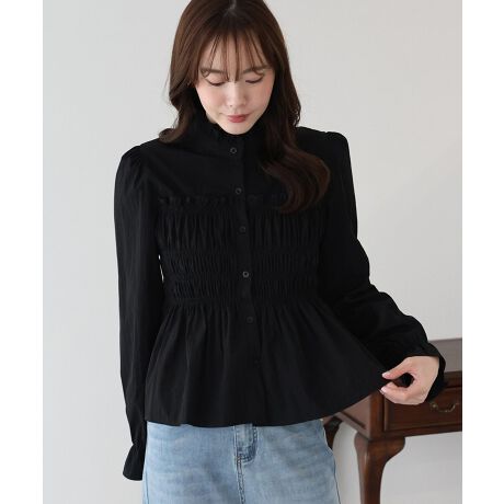 トレンドライクなペプラムデザインのシャーリングブラウス