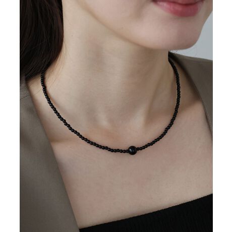 華奢な3mm玉のビーズネックレスのセンターモチーフにはオニキスや淡水パールを配置しメリハリ感をつけました。