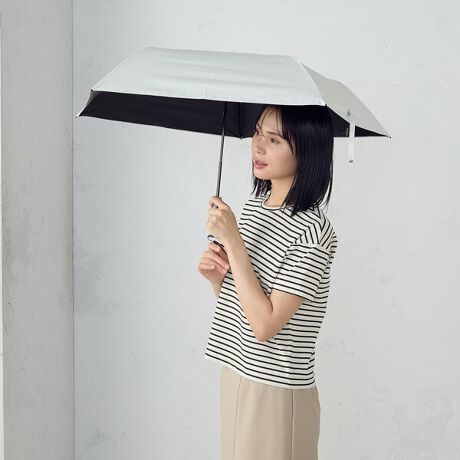 《デザイン》・耐水性に優れているので、雨傘としても安心して使用できる晴雨兼用の折りたたみ傘です。・傘の骨は軽くて丈夫なカーボン素材を使用し、わずか120gと軽量ですので、持ち運びに便利です。・生地の裏面を黒色のポリウレタン樹脂コーティング加工しているので、紫外線遮蔽率・遮光率100%と優れており、日差しのまぶしさや体感温度の上昇を防ぎ涼しくお出かけできます。《素材》軽量のポリエステル生地に防水・撥水加工をしています。さらに裏面にはポリウレタン樹脂コーディング加工をしています。《仕様》・親骨の長さ50cm・安全ろくろ付き・紫外線遮蔽率100%・遮光率100%《取り扱い》・製品には尖った部分があります。常に周囲の安全を確認してご使用下さい。・傘の開閉時には、顔や身体から離して使用してください。傘生地には防水撥水加工を施し、縫製には撥水糸を使用していますが、激しい雨や長時間のご使用では雨が染み込むことがございます。また飾り加工部分(刺繍、ステッチ、パイピング、テープ等)はデザインの特性上、完全な防水撥水加工が難しい場合があり雨が染み込みやすいのでご注意ください。・ハンドクリームや日焼け止めクリーム等が生地、手元の色落ちの原因になる場合があります。・ステッキかわりに使用しないでください。・手元または骨の先端が壊れたまま使用しないでください。・振り回したり投げたりしないでください。・強風の時は破損する恐れがありますので、注意してご使用ください。・ご使用後は陰干しして充分に乾燥させてください。濡れたまま放置すると生地の防水、撥水力の低下や骨の劣化につながります。・製品には構造上、骨同士が狭くなっている箇所がありますので、手や指を挟まない様に充分に注意してご使用ください。・傘骨にグラスファイバーを使用している場合は、破損した際に破損部分を触るとトゲが刺さる場合がありますので、直接触らないないようにしてください。・ご使用の際は、生地をほぐしてから開閉してください。無理に開くと骨が折れたり、傘全体に負担がかかる原因となります。・傘は必ず手に持ってご使用ください。・お子様には保護者の方からご注意ください。