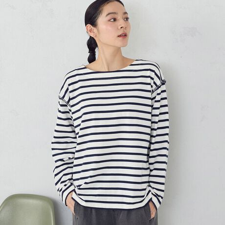 ハンドステッチ風の飾りステッチがポイントのボーダーTシャツです。