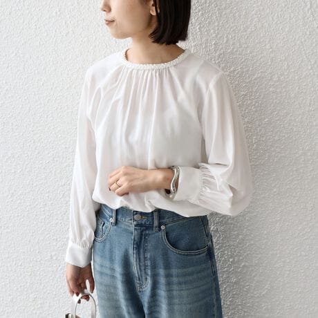1枚着トップスとしてデニムにタックインするだけでも、さりげない華やかさがあるコーディネートが完成します。