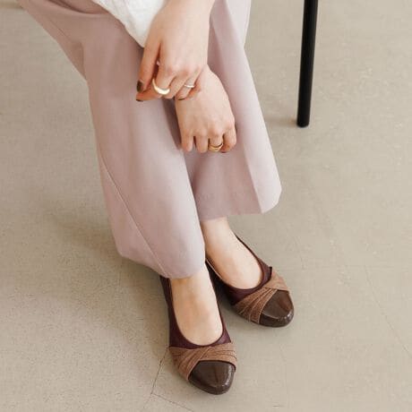 クリア箔加工を施した上品なプリーツリボンが大人な雰囲気に仕上げてくれます。中底全体に入った低反発クッションが足にフィットし、長時間の歩行でも快適な履き心地。 25AWの新色に、どんなコーディネートにも馴染むグレージュ、トレンドカラーを上品に取り入れたボルドーが登場します。