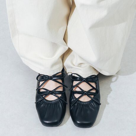 クシュっとしたギャザーデザインに華奢なリボンをアクセントに加えたウェッジミュール!柔らかくソフトな素材と軽量ソールを採用し、足当たりの良さと軽やかな履き心地にこだわり仕上げました。甲部分のダブルベルトが足をしっかり包み込み、ミュールタイプでもホールド感バッチリ◎約4.5cmのウェッジソールは足裏全体を支えてくれるので、長時間のお出かけでも安定感があり疲れにくいのも魅力の1つです。ワンピースやスカート合わせはもちろん、デニムやワイドパンツと合わせて大人カジュアルな雰囲気で履くのもおすすめ!コーディネートを格上げしてくれるリボンデザインは1足持っておきたいマストアイテムです。