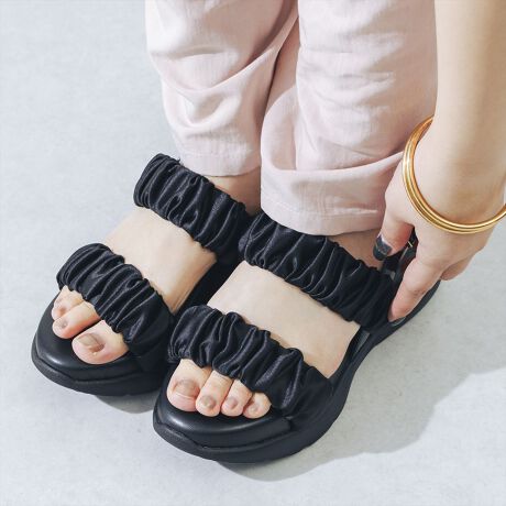 高級感のあるサテン素材と上品なシャーリングデザインが春夏のスタイリングを格上げしてくれる厚底サンダル!見た目からは想像出来ないほど超軽量で、もちもちふかふかの中敷きで1度履いたら病みつきになる履き心地に仕上げました。バックベルトには伸縮性のあるゴム素材を一部使用し、ベルトを外さなくてもサッと脱ぎ履き出来て楽ちん◎4段階サイズ調節可能で、自分好みのフィット感で着用出来るのも嬉しいポイントです。普段使いはもちろん、旅行やテーマパーク、フェスや推し活にもおすすめなアイテム!