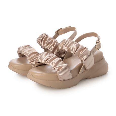 高級感のあるサテン素材と上品なシャーリングデザインが春夏のスタイリングを格上げしてくれる厚底サンダル!見た目からは想像出来ないほど超軽量で、もちもちふかふかの中敷きで1度履いたら病みつきになる履き心地に仕上げました。バックベルトには伸縮性のあるゴム素材を一部使用し、ベルトを外さなくてもサッと脱ぎ履き出来て楽ちん◎4段階サイズ調節可能で、自分好みのフィット感で着用出来るのも嬉しいポイントです。普段使いはもちろん、旅行やテーマパーク、フェスや推し活にもおすすめなアイテム!