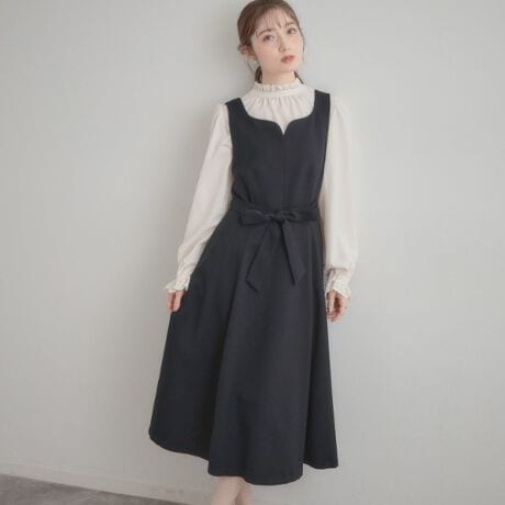 ハートネックの衿元ラインが可愛い、フィット&フレアーシルエットのジャンスカ