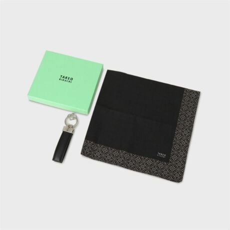 上品感のある合皮とメタルのコンビキーホルダーに、マラケシュをイメージしたタイル柄をパネル状にプリントした無地使い出来るハンカチのセット。