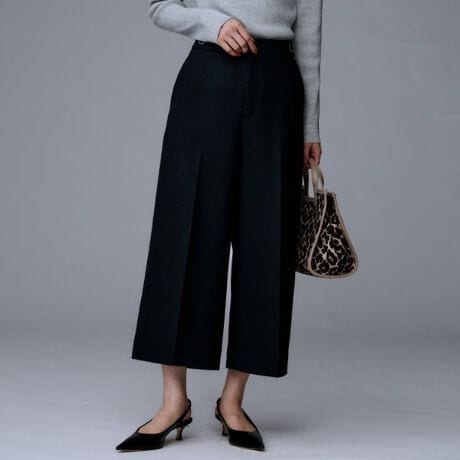 定番のクロップドワイドパンツは、センタープレスが施されたスッキリとしたシルエットが魅力です。