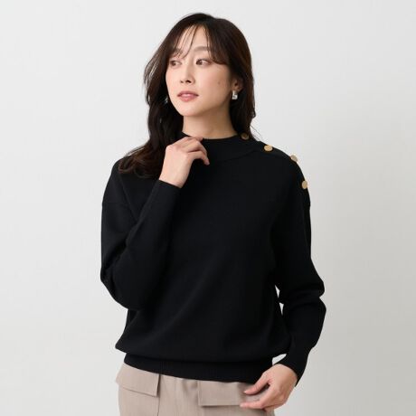 上品で控えめな輝きのゴールドの肩ボタンが目を惹くアクセントになって、華やかさを添えつつモダンさが共存した一枚。