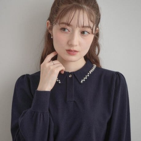 衿にフェイクパールを打ち込み、釦はキラキラとしたビジュー釦で1枚で華やかなニットです。