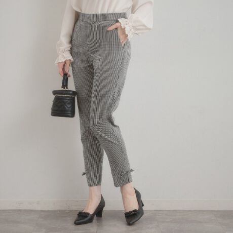 両脇裾に共生地の細リボンを縫い付けたデザインの細身スティックパンツ