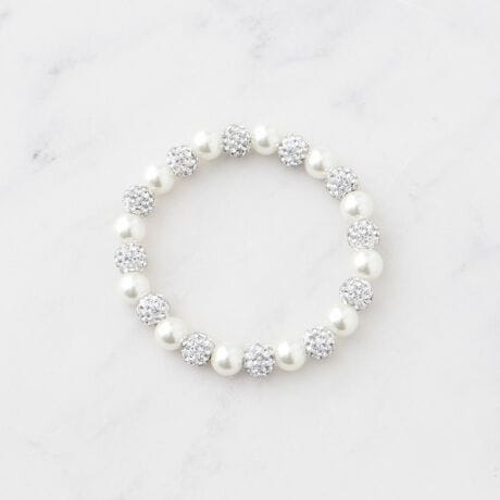 [型番:C7085401]パヴェボールとフェイクパールのブレスレット。ゴム仕様なのでヘアなどにもアレンジ可能。華やかなアクセサリーです。※照明の関係により、実際よりも色味が違って見える場合があります。また、パソコン・スマートフォンなどの環境により、若干製品と画像のカラーが異なる場合もございます。