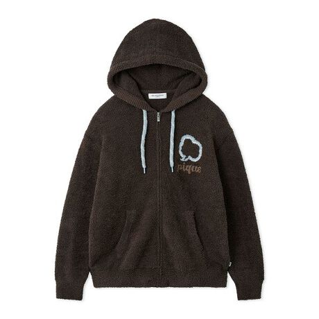 コミックの吹き出しのようなトークロゴのジャガードをあしらった、’ベビモコ’素材の温もりあふれるニットシリーズ。フロントに空の吹き出しとブランドロゴ、背面に大きな吹き出しメッセージをジャガードで入れたジップパーカです。フロントポケット付きで、ジャガードの色とリンクした鮮やかなスピンドル紐も付けました。全体が落ち着いたカラーリングなので、個性的でありながらもお手持ちのボトムに合わせやすく、着用しやすいのがポイントです。色はアイボリーとブラウンの2色をご用意。同シリーズのロングパンツと合わせるのもおすすめです。