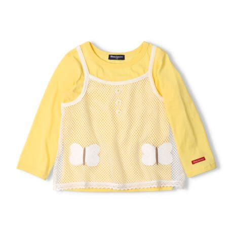 天竺素材の長袖Tシャツとメッシュ素材のキャミソール、ベストのレイヤード風、重ね着風デザインの長袖Tシャツ、ロンT。ベストには春らしい蝶々のモチーフ付。【アイテム】トップス シンプル ガーリー フェミニン カジュアル お洒落 オシャレ かわいい 可愛い 普段着 デイリーウェア お出かけ着 お外着 お外遊び着 子ども こども 女児 女の子 ガールズ キッズ ベビーサイズ トドラーサイズ 幼稚園 保育園 小学校 通園 通学 小学生 2026年春物新作 丸高衣料 ロングスリーブ 長袖 イエロー 黄色 ちょうちょ ムージョンジョン