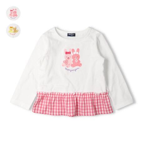 ピンクにはうさぎ、イエローにはネコのプリント入り。裾にはギンガムチェックのフリルが付いた女の子らしい長袖Tシャツ、ロンT。【アイテム】トップス シンプル ガーリー フェミニン カジュアル お洒落 オシャレ かわいい 可愛い 普段着 デイリーウェア お出かけ着 お外着 お外遊び着 子ども こども 女児 女の子 ガールズ キッズ ベビーサイズ トドラーサイズ 幼稚園 保育園 小学校 通園 通学 小学生 2026年春物新作 丸高衣料 ロングスリーブ 長袖 黄色 ウサギ ねこ 猫 動物 アニマル ムージョンジョン コットン100% 綿100%