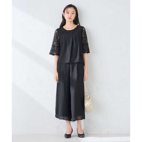 繊細なレースがドッキングされたブラウスとワイドパンツのセットアップアイテムです。
