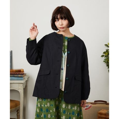 シンプルで大人かわいいスプリングコート。袖通しのやすい、ドロップショルダーのゆったりシルエットです。襟もとはノーカラーデザインですっきり見えを演出。シンプルなシルエットながらも、袖にやや丸みを持たせ女性らしい印象を後押し。大きな配色ボタンがデザインのアクセントに。それぞれのカラーに合わせた鳥のプリント裏地付きです。どんなボトムスにも馴染むミドル丈で、日常使いにぴったりなコートです。
