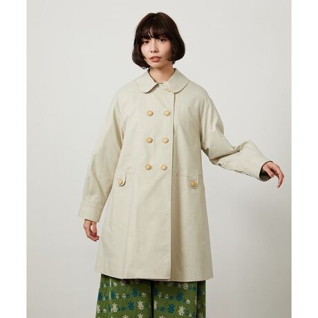 シンプルで大人かわいいスプリングコート。袖通しのやすい、ドロップショルダーのゆったりシルエットです。袖口にタックを施し、袖にやや丸みを持たせ女性らしい印象を後押し。大きいめの丸襟やダブルボタンデザインがレトロな印象に。ポケット口の小さなフラップデザインにも注目です。それぞれのカラーに合わせた鳥のプリント裏地付き。長すぎない丈で日常使いにぴったりなコートです。