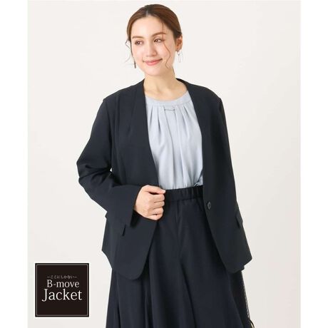 後ろ衿を少し立ち上げVネックラインに胸元をすっきり見せるノーカラーデザイン。