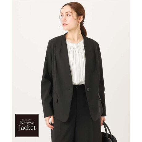 後ろ衿を少し立ち上げVネックラインに胸元をすっきり見せるノーカラーデザイン。