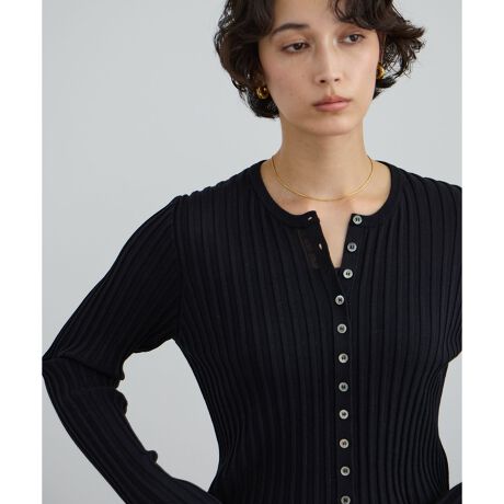 ワイドリブのクルーネックカーディガン。