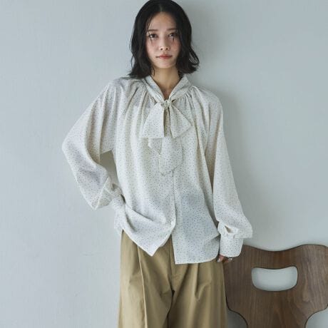 ・肩のギャザーとボリューム感のある袖がゆとりのあるシルエットに
