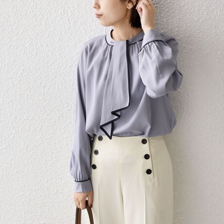 襟元・ボウタイ部分・袖口に施したパイピングの配色が目を惹く上品なブラウス。
