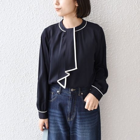襟元・ボウタイ部分・袖口に施したパイピングの配色が目を惹く上品なブラウス。