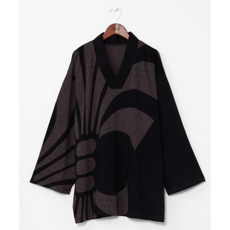 [型番:7CC-6104-2025]肌ざわりの良いコットン素材を使用したメンズトップス。束ね熨斗(たばねのし)、扇、宝袋など縁起の良い柄を大胆にあしらい、着る人に福を呼び込むような華やかさがあります。合わせ衿のデザインが和装らしさを演出し、ゆったりとしたシルエットで動きやすさも抜群。日常に取り入れやすい和モダンなトップスです。