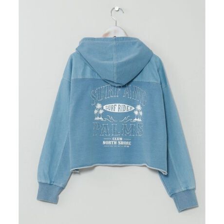 [型番:47U-6101-2025]デニム風裏毛とデニムの切り替えデザインが目を惹くフード付きトップス。背中のパッチ刺しゅうとプリントがアクセントに。短めの丈感でバランス良く着こなせ、ハーフパンツやパンツとのセットアップコーデもおすすめです。