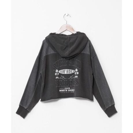 [型番:47U-6101-2025]デニム風裏毛とデニムの切り替えデザインが目を惹くフード付きトップス。背中のパッチ刺しゅうとプリントがアクセントに。短めの丈感でバランス良く着こなせ、ハーフパンツやパンツとのセットアップコーデもおすすめです。