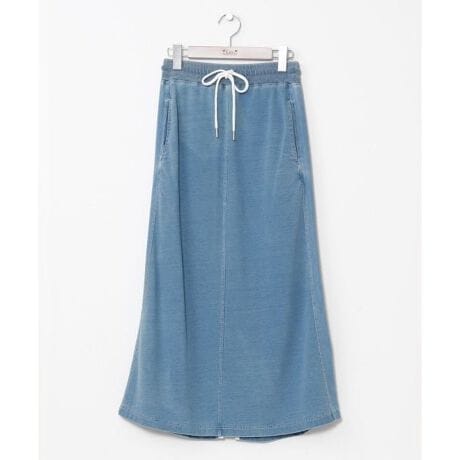 [型番:47U-6102-2025]デニム風裏毛とデニムの切り替えデザインが魅力のスカート。後ろポケットのプリントがさりげないポイントに。タイトなシルエットながらも、裏毛素材とスリットで動きやすく、トップスとのセットアップコーデも楽しめます。