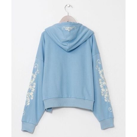 [型番:4CA-6104-2025]短丈シルエットのフード付きトップス。裏毛素材で心地よい着用感です。袖とフードに施されたハイビスカスの刺しゅうがポイントで、フードを被ったときにもデザインが映えます。パンツとのセットアップコーデもおすすめ。