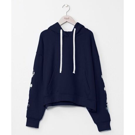 [型番:4CA-6104-2025]短丈シルエットのフード付きトップス。裏毛素材で心地よい着用感です。袖とフードに施されたハイビスカスの刺しゅうがポイントで、フードを被ったときにもデザインが映えます。パンツとのセットアップコーデもおすすめ。