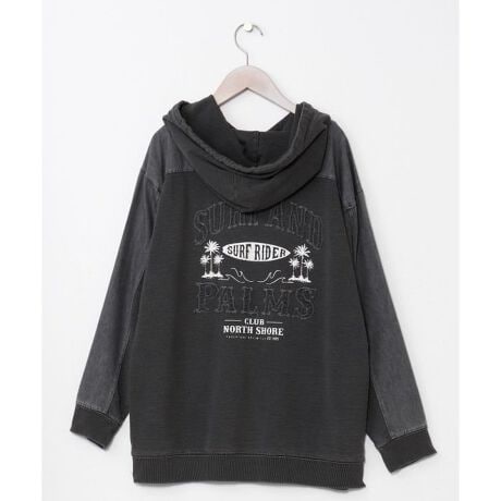 [型番:47U-6103-2025]デニム風裏毛とデニムの切り替えデザインが印象的なメンズフード付きトップス。背中のパッチ刺しゅうとプリントがポイントになっています。ハーフパンツやパンツとのセットアップコーデで、統一感のあるカジュアルスタイルに。